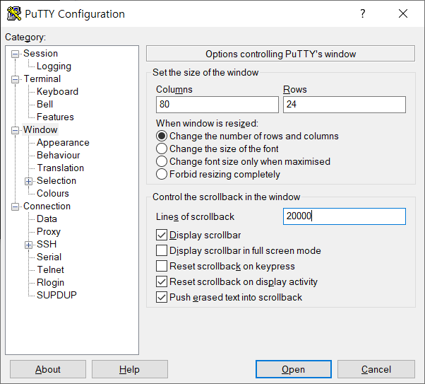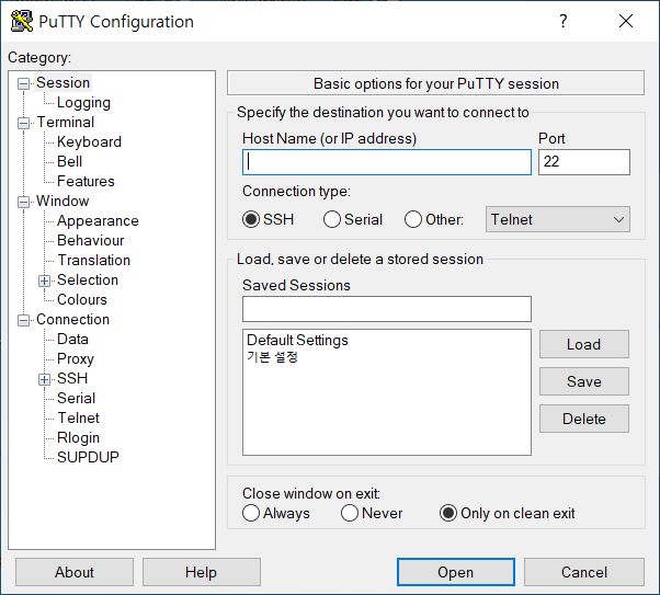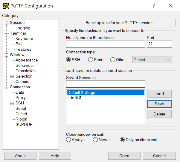 Putty를 설치를 하든지, Portable 버전을 사용하던지 첫 화면은 똑같을 것입니다.