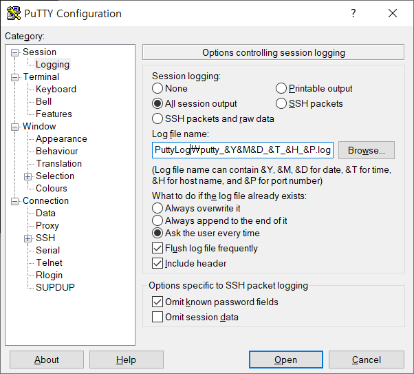 All session output은 ANSI문자들이 포함되어 저장되어, 화면과 동일하게 저장됩니다.